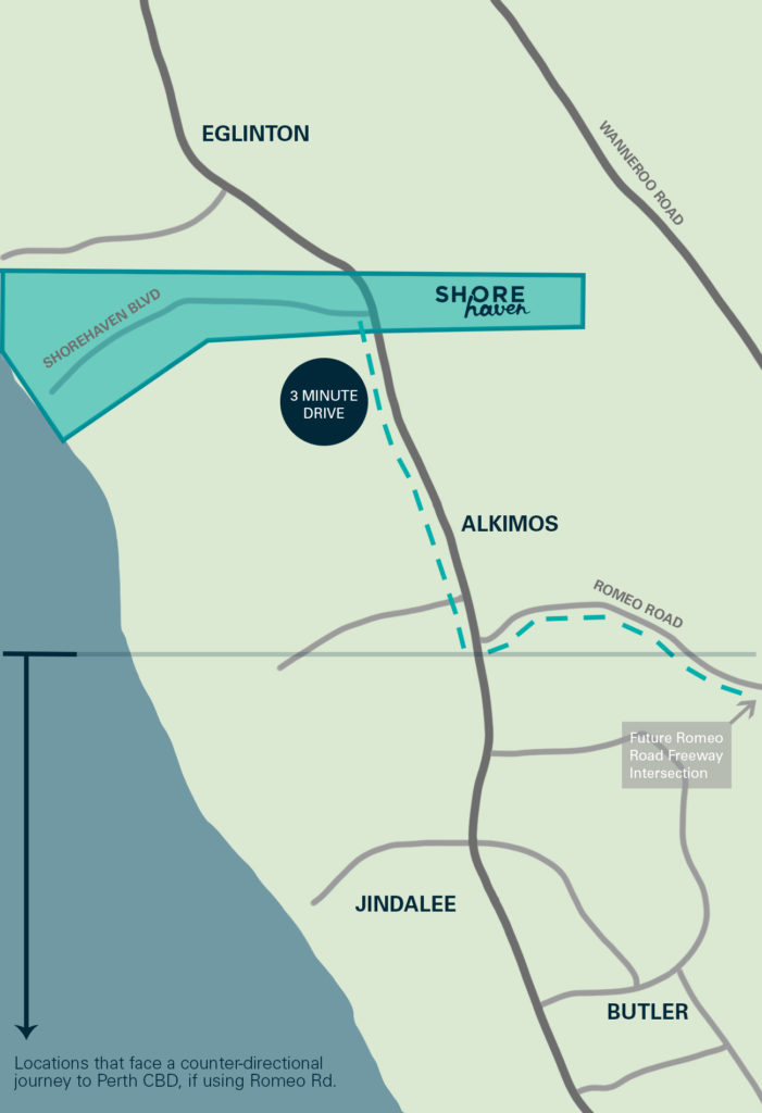 Here at Shorehaven, we’re in a unique position that benefits you. We are one of the closest communities situated north of Romeo Road (just a 3 minute drive), meaning we have a direct route to the future freeway intersection and beyond to Joondalup, Perth CBD and more.